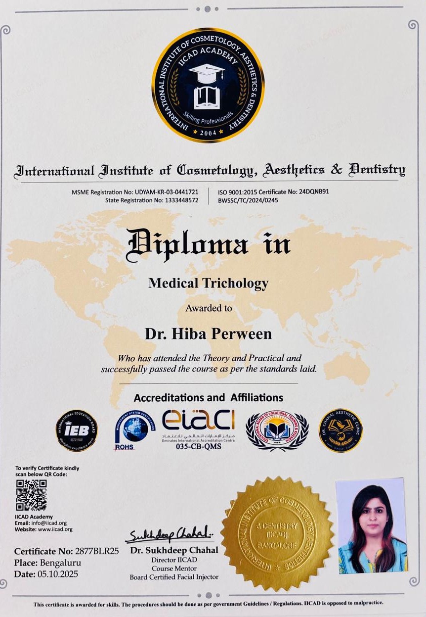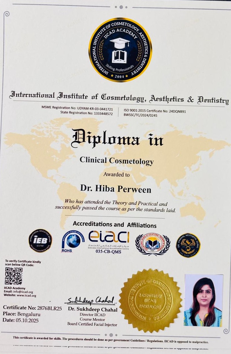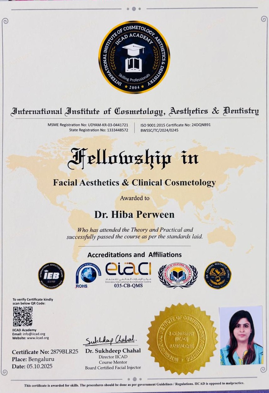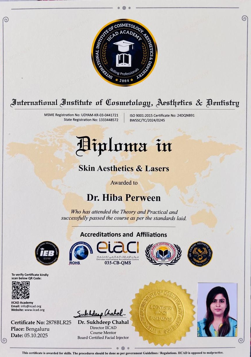 Dr. Perween is highly regarded for her ability to blend modern aesthetic techniques with ethical clinical practice. She continually updates her skills to stay aligned with the latest advancements in cosmetology, ensuring patients receive effective, evidence-based, and result-oriented care. Driven by a passion for enhancing natural beauty, Dr. Hiba Perween strives to provide refined, personalized solutions that deliver safe, satisfying, and lasting results.